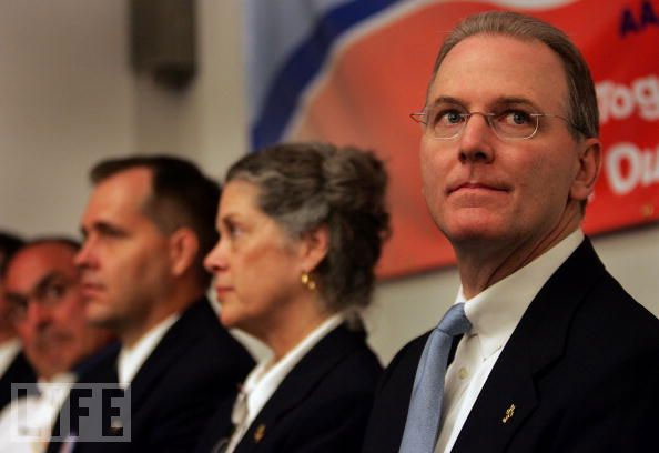 Gerard Arpey looks like the cat who just caught the bird. Here he's gutted the labor contracts and now the unions are helping him promote the underfunding of American's pension plans to Congress. Tommie Hutto-Blake is to the right.